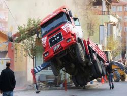 ANKARA  /Başkent Elektrik A.Ş.’ye ait Gençlik Caddesi Hakim Evi Bahçesi’nde bulunan trafonun yenilenmesi için yapılan yıkım çalışmaları esnasında, trafo duvarlarını kaldıran Vinç yerden 2 metre havaya kalktı. Trafo önünde Bulunan As Taksiye ait Taksi Yazıhanesi Vincin altında kalmaktan son anda kurtuldu.