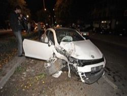 Düğün konvoyundaki lüks otomobil betonarme aydınlatma direğine çarptı. Araçtaki iki kişi yaralandı