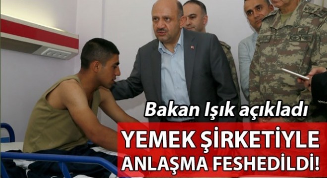 Manisa 1. Piyade Er Eğitim Tugay Komutanlığında yaşanan besin zehirlenmesi üzerine Manisa'ya gelerek hastanede tedavi altında olan askerlere geçmiş olsun ziyaretinde bulunan Milli Savunma Bakanı Fikri Işık birliğe yemek sağlayan firmayla sözleşmenin feshedildiğini açıkladı. Milli Savunma Bakanı Fikri Işık Manisa 1. Piyade er Eğitim Tugay Komutanlığında yaşanan besin zehirlenmesi üzerine Manisa'ya geldi. Manisa Merkezefendi Devlet Hastanesinde tedavi olan askerlere geçmiş olsun ziyaretinde bulunan Bakan Işık ziyaretin ardından basın toplantısı düzenleyerek açıklamalarda bulundu. Bakan Işık, "Bu akşam saat 18.00'da akşam yemeği sırasında Batı Kışlamızda toplu rahatsızlanma şikayetiyle hastanelerimize askerlerimiz sevk edildi. Akşam yemeğinde toplam 5 bin 470 askerimiz yemek yedi. Bu yemekten etkilenen asker sayımız 590. Bu askerlerimizin ilk muayeneleri revir başta olmak üzere yapıldı. hastanelere sevk edilen asker sayımız 372. Şuanda hastanelerimizde olan asker sayımız 72. Allah'a hamd olsun şuanda bu askerlerimizden hayati tehlikesi olan yok. Yoğun bakımda olan askerimiz de yok. Şuana kadar 51 askerimiz de tedbir amaçlı olarak hastanemizde tutuluyor. Özellikle Batı Kışlamızda da 40 askerimiz tedbir amaçla müşahade altında tutuluyor. Hiç yemek yemedim diyerek rahatsızlanarak hastaneye gelen de var. Sadece çorba içtim cacık yedim diyerek hastaneye gelen de var. Menüdeki 'çorba, tavuk, pilav, cacık, tatlı yedim' diyerek hastaneye gelen de var. Dolayısıyla bütün bu ifadelere de dikkatlice bakıyoruz ve bu noktada alınması gereken hangi tedbir varsa almanın gayreti içerisindeyiz." dedi.