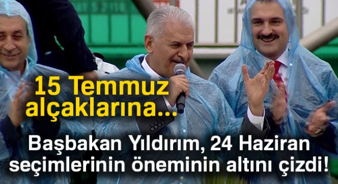 Başbakan Yıldırım, 24 Haziran seçimlerinin öneminin altını çizerek, “Bu seçimde şer odakları bir araya geldiler. İçeride ve dışarıda Türkiye’nin büyümesini, gelişmesini ve bölgede söz sahibi olmasını hazmedemeyenlere, memleket sevdalıları ile cumhur ittifakı ile yola çıkanların 15 Temmuz alçaklarına dersini vereceği önemli bir seçimdir. Şehitlerimizin emaneti üzerimizdedir. Ülkemizin bağımsızlığına, ay yıldızlı bayrağımıza kalkan elleri bir daha geri gelmemek üzere kıracağımız önemli bir tarihtir” dedi.