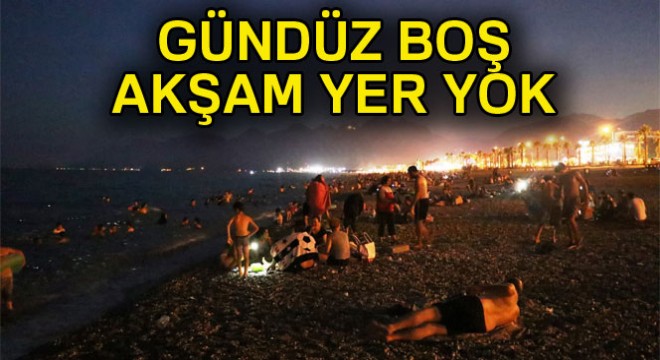 Son 88 yılın en yüksek sıcaklığını yaşayan Antalya’da vatandaşlar denize gündüz yerine akşam girmeyi tercih ediyor. Haftasonu olmasına karşın aşırı 44 dereceyi bulan sıcaklıktan dolayı dışarı çıkmayan Antalyalılar, güneşin batmasının ardından soluğu sahillerde alıyor. Akşam 19.00’dan itibaren dünyaca ünlü Konyaaltı plajına aileleriyle birlikte gelen binlerce vatandaş, yakamoz manzaralı akşam yemeklerini sahilde yiyor, ardından da serinlemek için denizin keyfini çıkartıyor. Denizde serinledikten sonra çakıl taşlar üzerinde uyku keyfi de yapan Antalyalılar, geç saatlere kadar sahillerde duruyor.